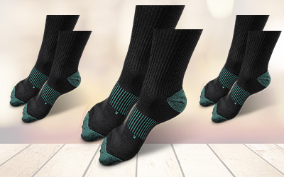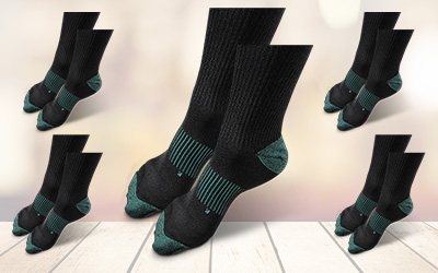 Research shows that compression socks significantly boost blood circulation, allowing fresh oxygen to travel through legs, ankles, feet, and toes. This can help relieve pain, swelling, stiffness, and more, support healing from injuries and boost recovery time. Compression socks also help increase stamina, making it easier to stay on your feet for longer periods of time, which is why many athletes wear them. Other benefits include protection from deep vein thrombosis (DVT) and treating foot fungus.